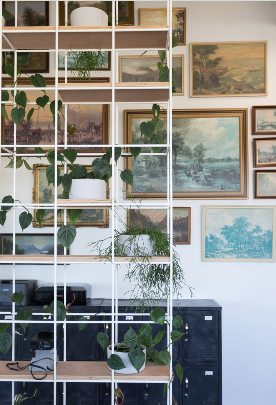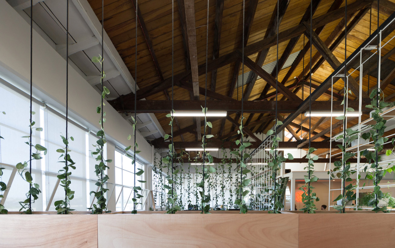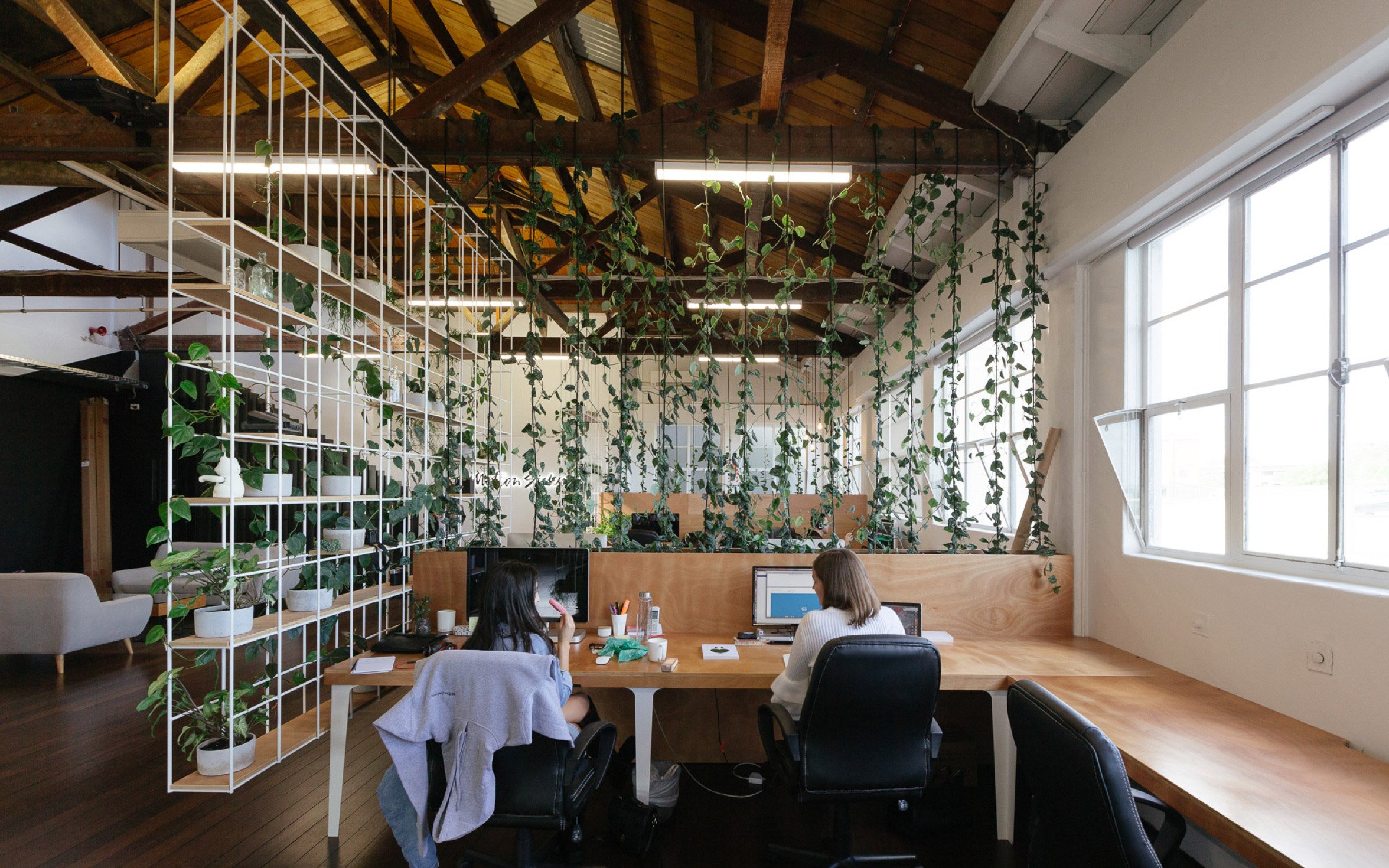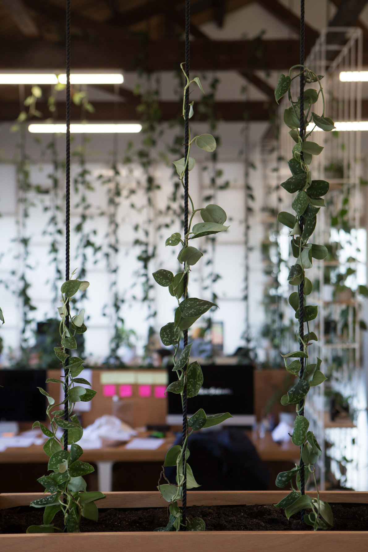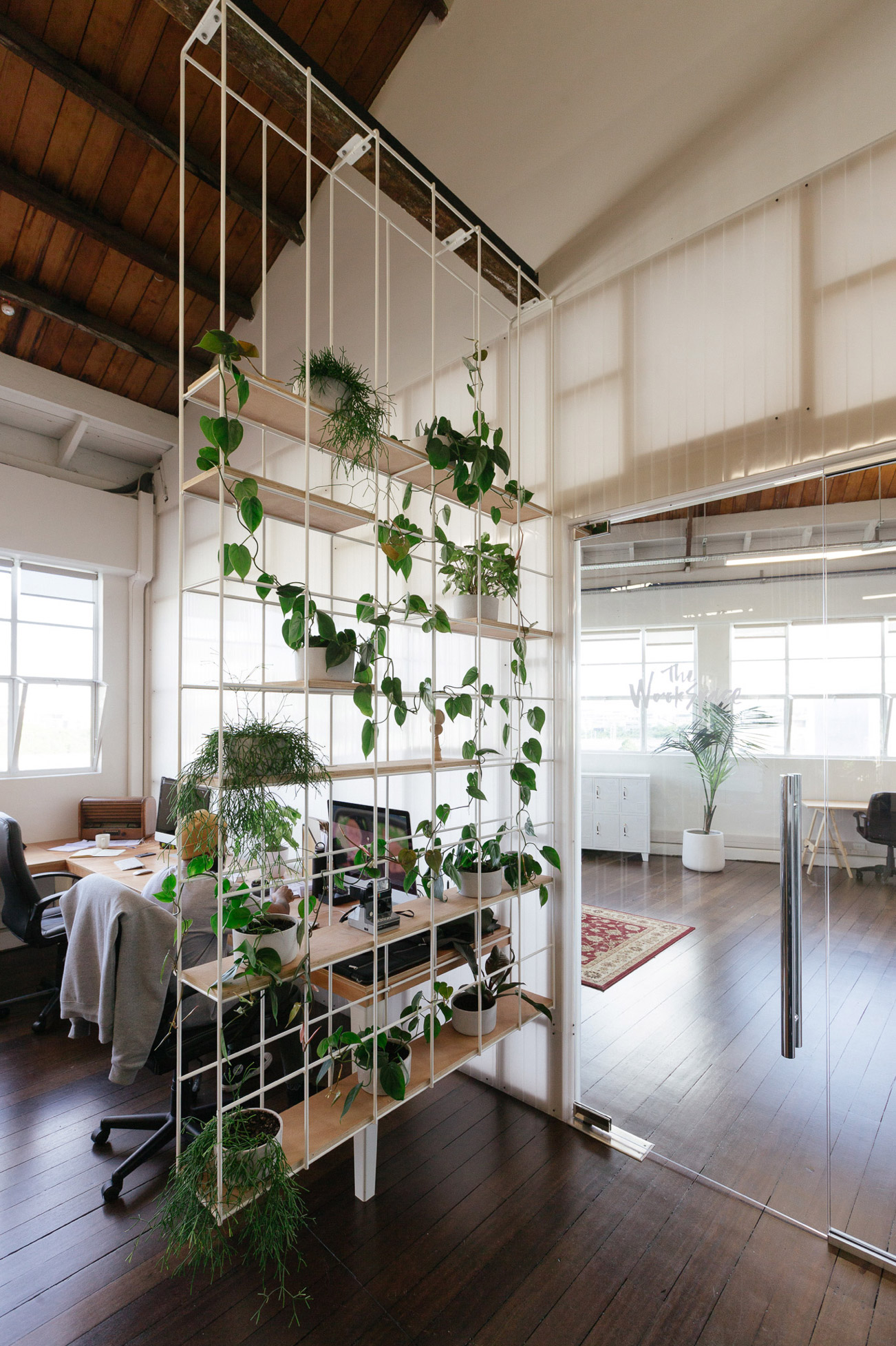 This beautifully designed studio by our friends 'Think and Shift' wanted to create a division for this large footprint space without losing too much natural light. The natural light creates a perfect environment for plants to flourish in and a workspace where the plants are used to create a sense of space, division, and privacy. Selecting the right plants that could survive in this space and quickly clamber up the ropes and shelving areas make this happen. Maintained weekly by Flora n Fauna these botanicals are thriving and looking lush! Check out the before and after shots in the about section.