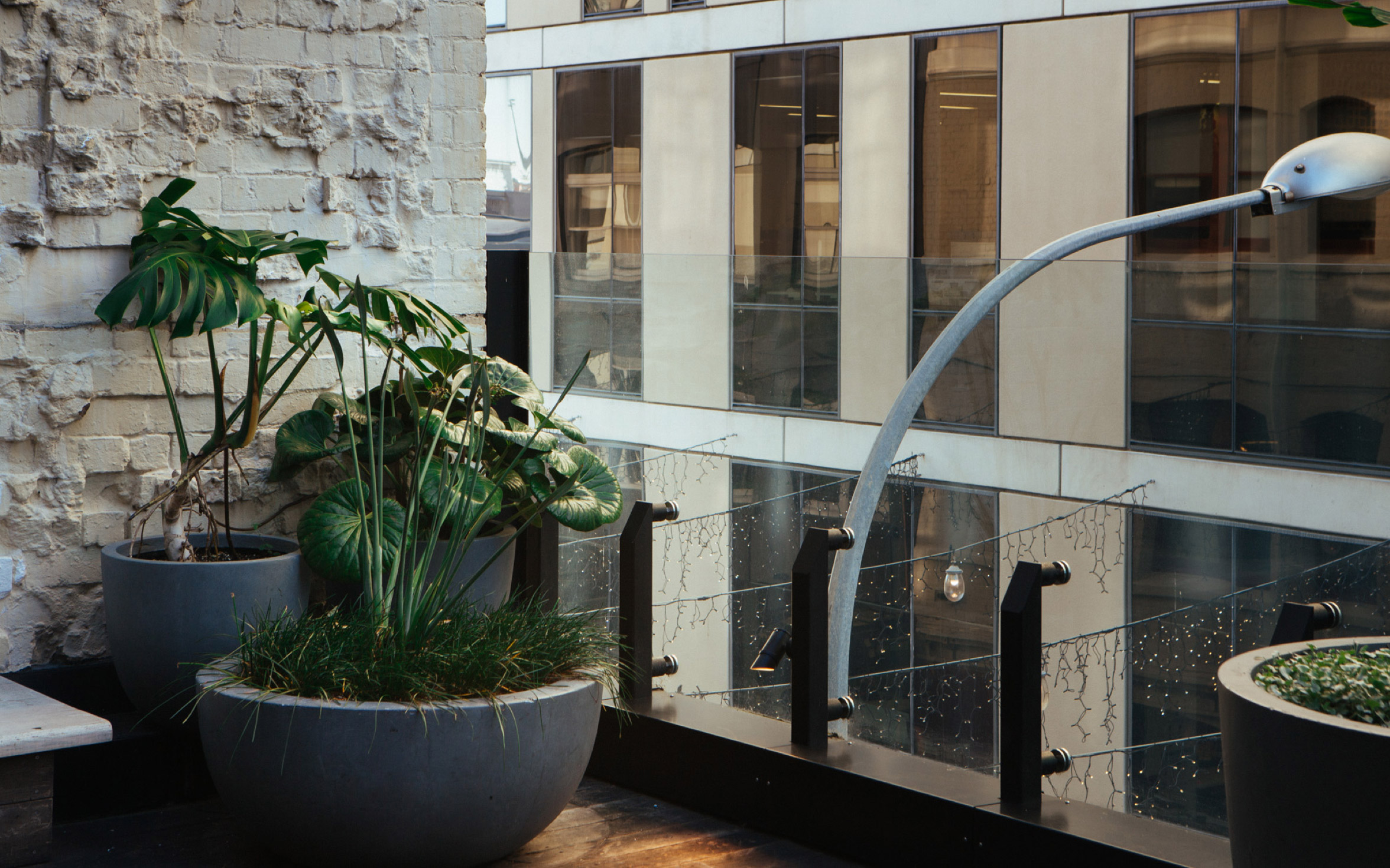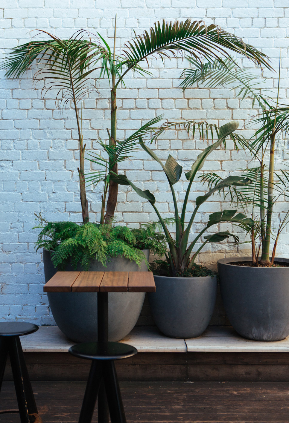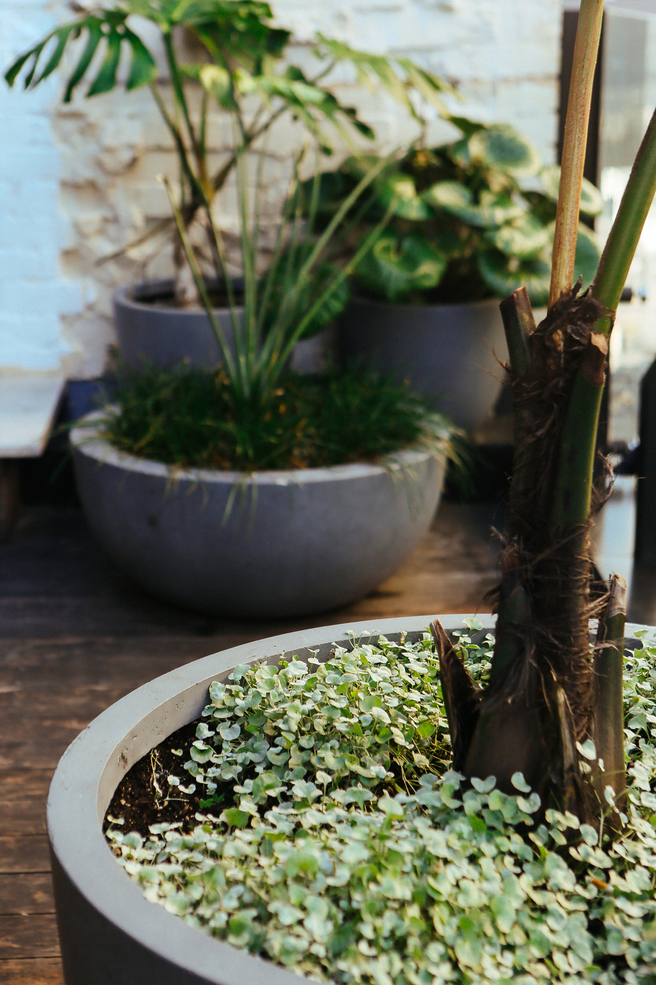 An urban jungle is created on this inner city terrace using tropical palms, bird of paradise, bromeliads, and ficus with ground covers and trailing plants that cascade over these oversized planters. Layered planting creates a lush green jungle against the city buildings backdrop.