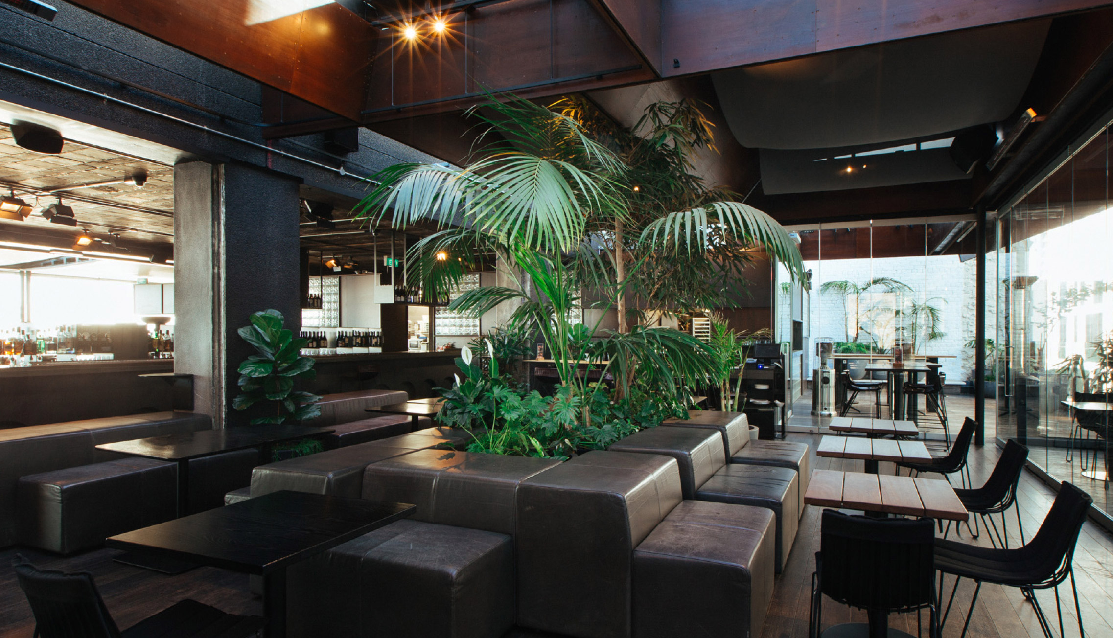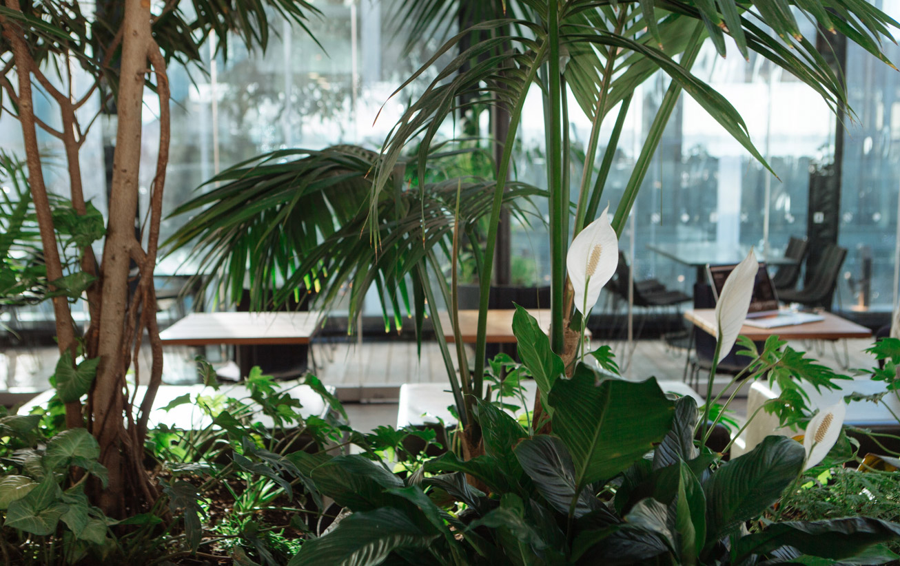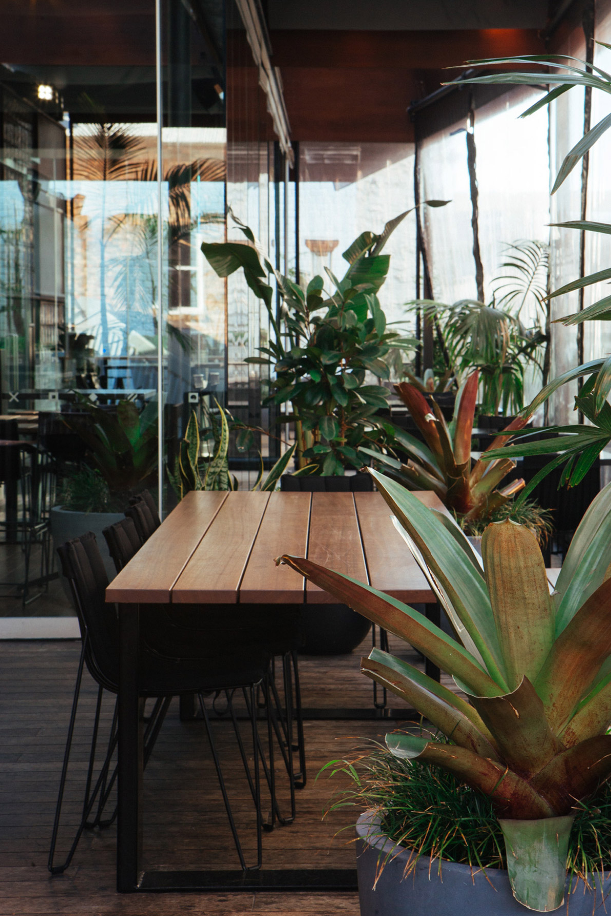 An urban jungle is created on this inner city terrace using tropical palms, bird of paradise, bromeliads, and ficus with ground covers and trailing plants that cascade over these oversized planters. Layered planting creates a lush green jungle against the city buildings backdrop.